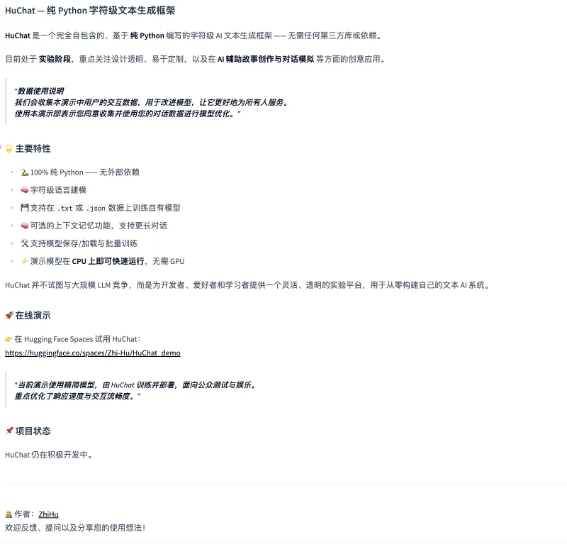 **HuChat** 是一个完全自包含的、基于 **纯 Python** 编写的字符级 AI 文本生成框架 —— 无需任何第三方库或依赖。