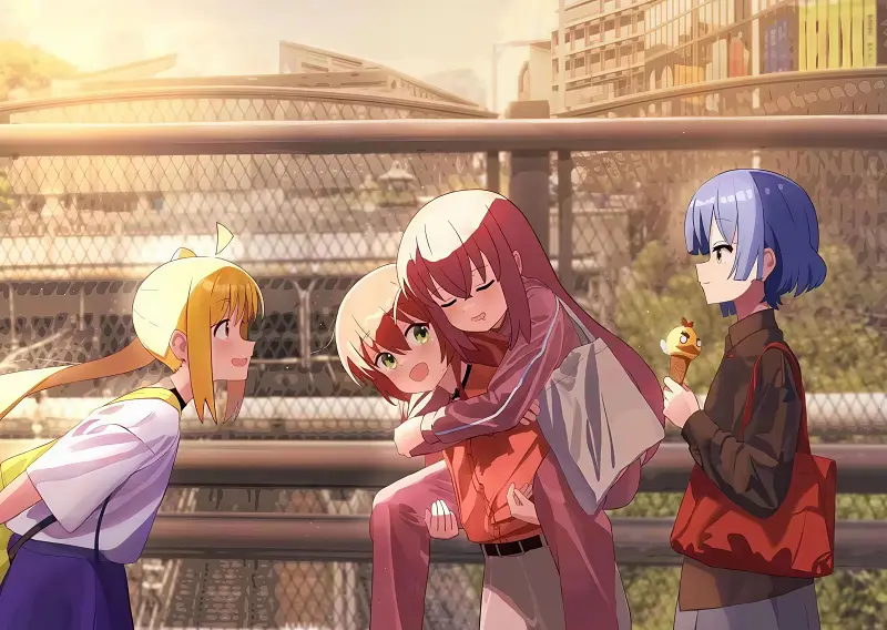 电车依旧在晃动,四个少女下了车,领头的郁代飘逸着红发,时不时回头看看队友的身影,然后像个向导一样前进,结束乐队活像一个旅游团,那么后藤一里一定是那个体力不支的吊车尾——在大量的赶路上,也使得郁代的回头有了点指向性。