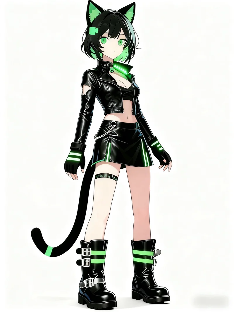 描述:“上身有时还会加一件紧身长袖黑色皮革外套,立领,有部分破损,立领内部分布着芯片和绿色底板的基础电路图,他们通过外面的绿色灯带加以保护并在晚上能够通过发亮的灯带看见领子里面的电路图。 ”