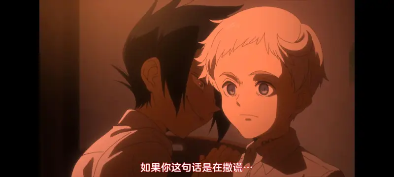 首先是诺曼,诺曼在刚才在对话中已经确定了雷虽是内奸但并不是敌人,并且可以好好利用雷这个“内奸”的身份。确信了之后便开始思考雷作为己方的王牌有哪些优势,从破坏发信器,农场的情况,越狱的新情报,牵制伊莎贝拉,雷无疑就是目前最大并且最厉害的战斗力。从某些方面来讲甚至能逆转目前的局面,这也是为什么诺曼思考着思考着便惊喜地捂住了嘴,他从雷身上看到了更多逃出孤儿院的希望。但是前面也提到了,雷做出这一切的行动要基于“只是他们三人越狱,最多也只能带冬和吉尔达”。但是诺曼答应了艾玛,也希望能拯救所有人,即使艾玛很单纯,愿望很美好,他也不想欺骗艾玛。诺曼相信以自己的能力一定会拯救所有人的,所以暂且准以备“假装骗艾玛来欺骗雷”让雷成为自己的王牌。动画表现确实比漫画差了点,心理戏删的有点多,但多了对峙后诺曼和雷的神情描写也还算可以。