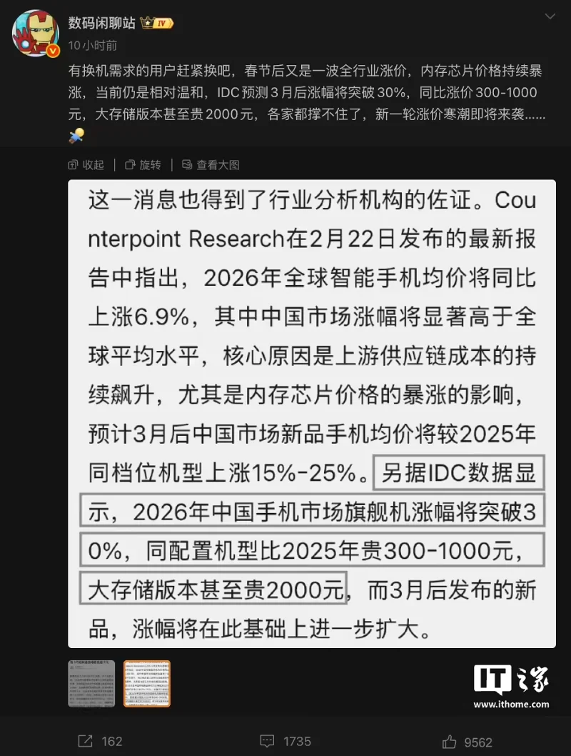 博主 @数码闲聊站 援引新浪科技及 IDC 消息,称因内存芯片价格持续暴涨,2026 年春节后全行业将迎来新一波涨价,建议有换机需求的用户尽早换机。