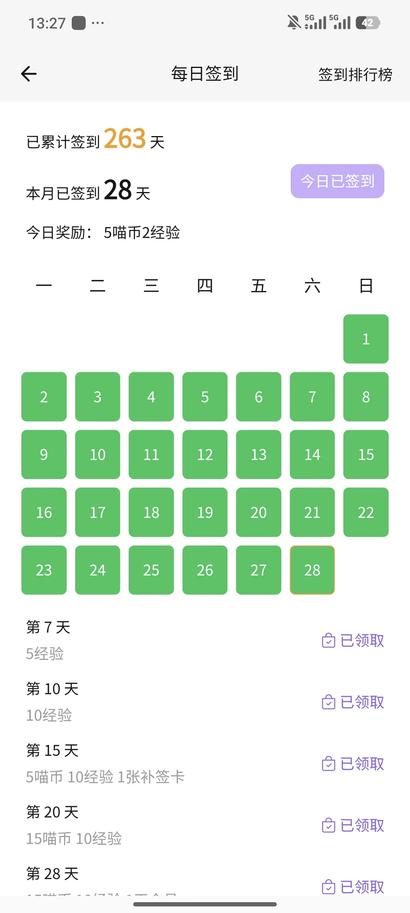 虽然说呢已经是全月签到名义上的,但是实际上是漏了一天才用一天补天卡来完成的