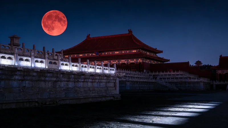 侍立在丹陛之下的太监尖着嗓子报罢,身子早已矮了半截,瑟瑟缩缩不敢抬头。但见那红月自紫禁城角楼之上冉冉升起,绯猩如血,泼洒在琉璃黄瓦、白玉雕栏之上,整座皇宫竟似浸在一片血色之中,往日里庄严肃穆的殿宇楼阁,此刻都透着一股说不出的阴寒诡异。