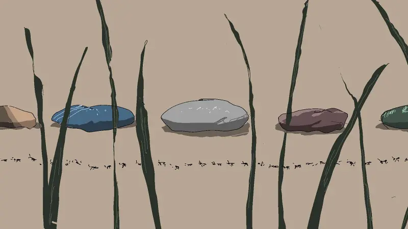 在阿明不在的这段时间里,他们三个人已经搭好了一个“棺材”。用的是叶子。他们把地上的落叶一片片捡起来,堆在一起,摆出一个棺材的形状;接着又把土轻轻盖在上面,埋葬着秋天;最后再放上一块石头压住。这样一来,“安葬”的步骤就算完成了。剩下的,就只等阿明回来点蜡烛了。