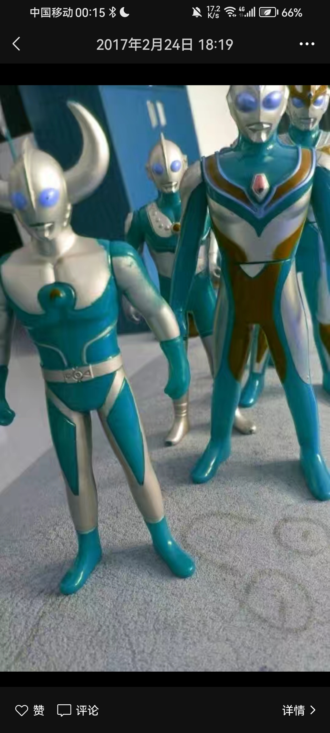 我从第一条开始看起:这是一个塑料奥特曼列祖列宗的图片,一个奥特之父,一个戴拿,一个银河,一个佐菲。噢,我想起来了,那些从百佳华买来的各式各样的人偶。至于他们的玩法很多,我最喜欢给他们摆成打架的阵仗。记起来当时有两个奥特之父,两个磨损各有轻重,我就把严重的当作假奥父,让另外一个去“打”他。