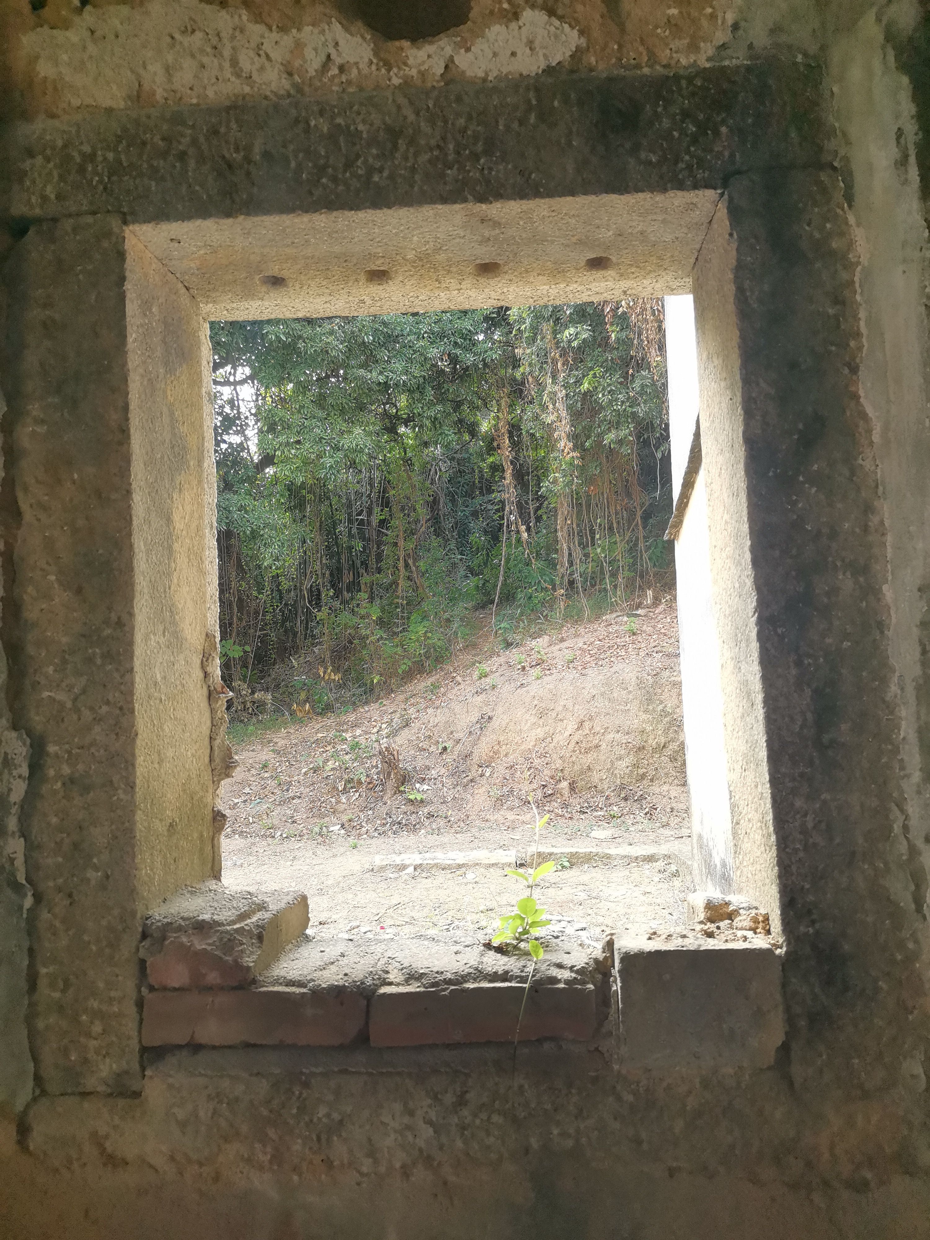 16:08,终于到顶,其实除了一个坡显得比较困难外,其他都还好。几个工人围着一栋老屋施工,我绕过他们,终是看到了这栋建筑,门上写着“宝安区不可移动文物——水田村东碉楼”,是去年末新安的。门的右侧用红漆涂了个“今日学习毛主席”后面看不清了。现在看来是破落了,但屋角罗马柱式的柱子,墙上的雕花似乎都述说着这里的过往。楼梯是木制的,断了,加之拉了个警戒线,只是在一楼看看。至于一楼的侧边似乎是厨房。我看见了一个水槽,腻腻的水不知是何时的了。灶台堆满了红砖,旁边是古早风味的瓷砖字——出入平安。看着用过的煤,粉色的毛刷,鞭炮的塑料纸,掉落的衣架,也不知是什么时候没人的。