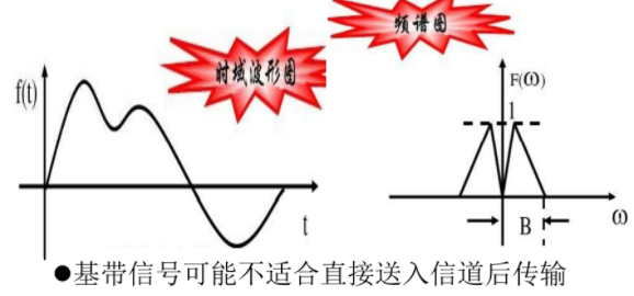 上面两条记住就好,下面引入的调制定理相当重要。为此我们先要知道何为基带信号。基带信号由原始消息直接直接转换成电信号,由此可见其各种特征(频率等)均不太适合直接传入到信道中。