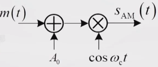 常规调幅AM(Amplitude Modulation)消息信号m(t)加上直流分量A0(后面解释为什么要加上直流分量),再与载波相乘。