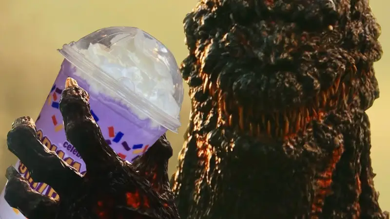 the king of the monsters tries out the grimace shake , the drink that has been so popularized due to its mysterious nature, featuring shin godzilla and his legendary counterpart, gare-goji (G2014)!